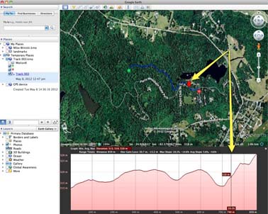 I took a field trip with a colleague who is headed to Guatemala in a couple of days in order to test the elevation accuracy of the iPhone, iPad, and Trimble Nomad. I’ll post the results shortly. I discovered a feature in Google Earth that I didn’t know existed–the elevation profile. After adding a track we recorded of our hike back using MotionX HD on the iPad to Google Earth, it was easy to create an interactive elevation profile of the short trip. The yellow arrows show the point-of-interest on the path and the corresponding location on the elevation profile. Pretty cool!